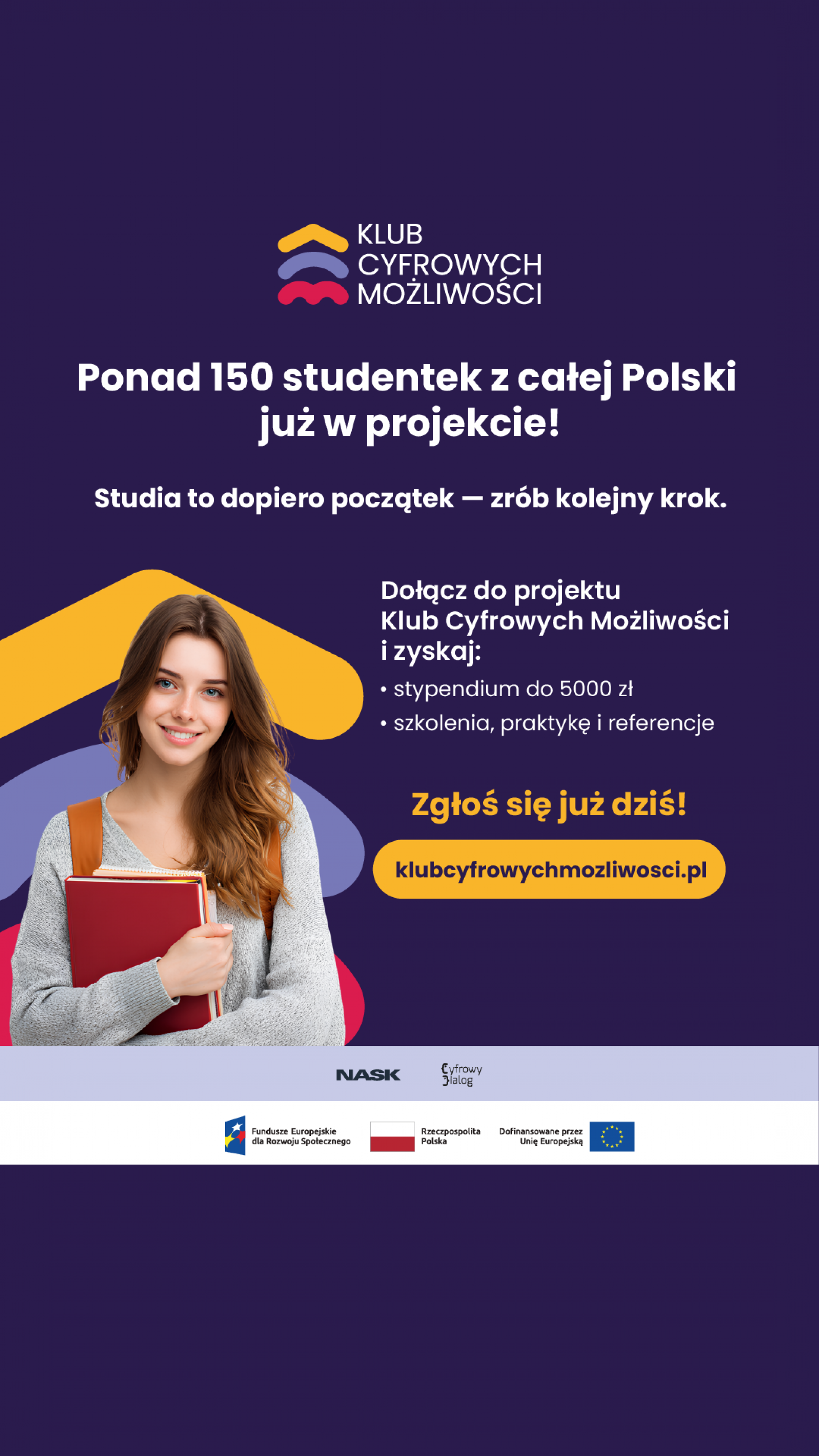 Jesteś studentką co najmniej drugiego roku na kierunku ścisłym lub związanym z nowymi technologiami? Chcesz zdobyć wiedzę, umiejętności, referencje, a także stypendium, które może wynieść nawet 5000 zł w skali roku? Dołącz do projektu Klub Cyfrowych Możliwości. Zrobiło to już ponad 150 dziewczyn z całej Polski!